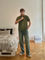 Men's short-sleeve button-down shirt in a dark olive green color. It features a subtle, all-over textured pattern woven into the fabric. The shirt has a classic collar and is displayed hanging on a silver hanger.